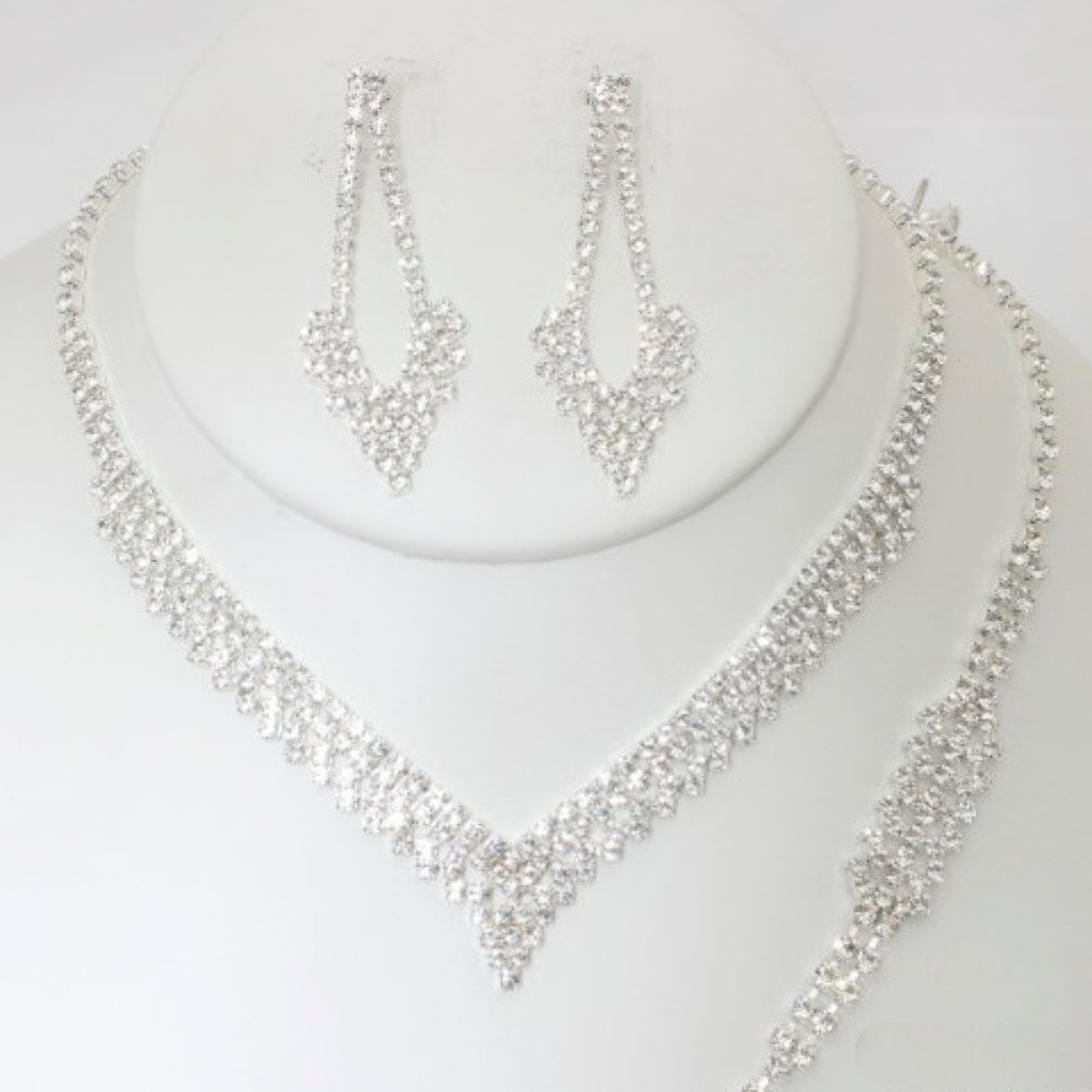 Add instant elegance to your look with our Rhinestone Necklace Earring Bracelet Set. Includes necklace, earrings, and bracelet in both gold and rhodium tones. Meticulously designed with high-quality materials for lasting shine. Perfect for any occasion.