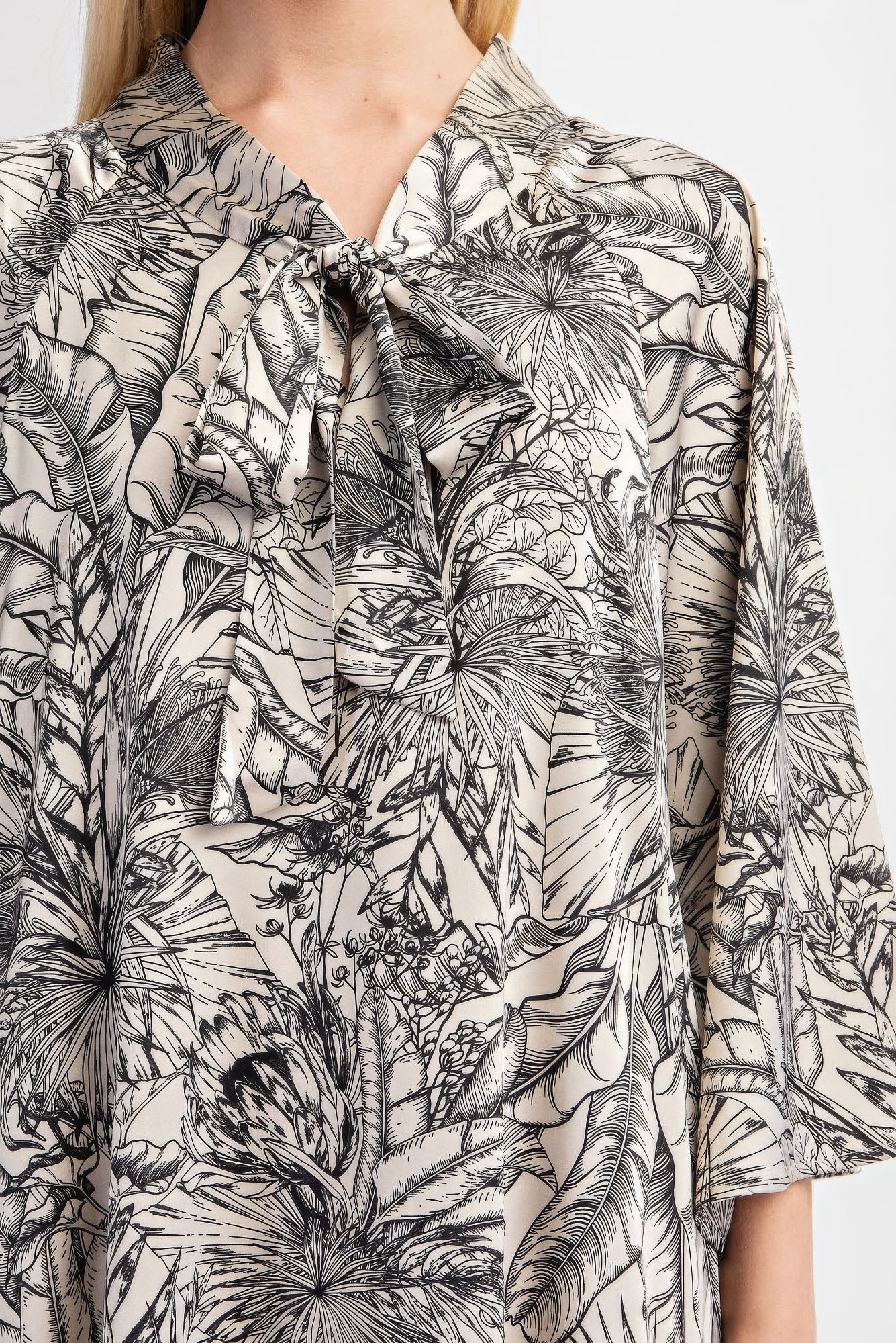 Made from high-quality satin fabric, this dress offers a luxurious feel and elegant drape in sizes Small, Medium, and Large. The black color adds sophistication and versatility, while the elegant print and tie neck detail exude sophistication. Perfect for any occasion, this dress is comfortable for all-day wear and crafted with quality and durability in mind. Dry clean only to preserve the fabric's integrity and shine.