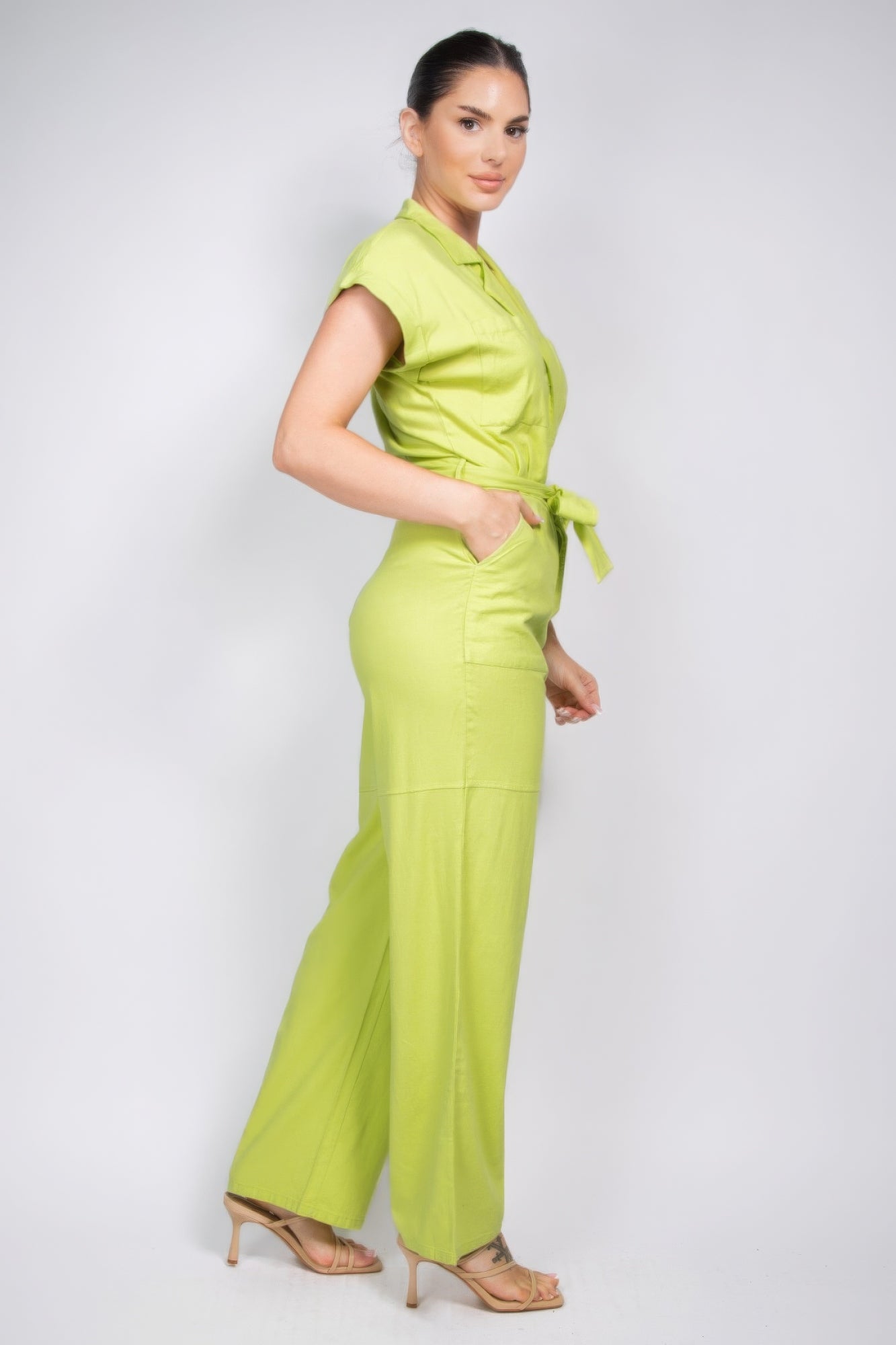 70% Rayon, 27% Linen, and 3% Spandex blend for comfort and stretch, fitted with a defining belt. Available in vibrant Lime and sizes S, M, and L. Features collared neckline, button-down closure, short sleeves and pockets. Versatile style for casual or semi-formal occasions.