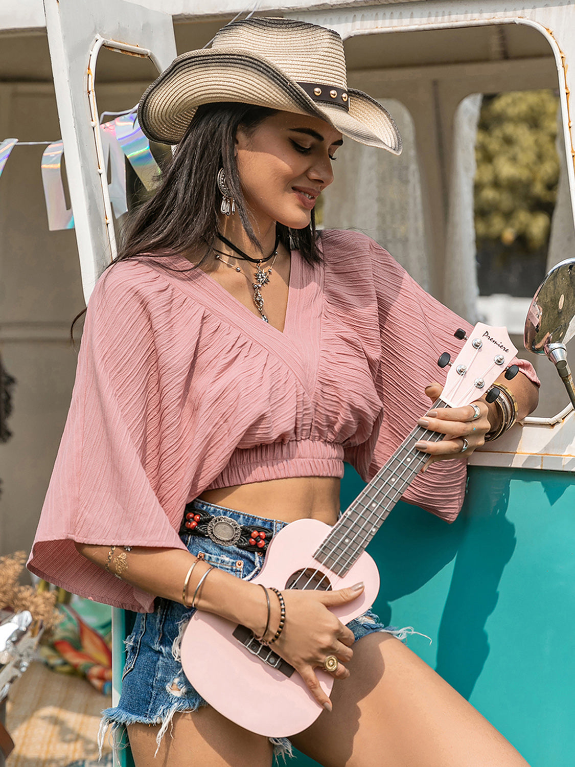 Material composition: 100% polyester. Machine wash cold and tumble dry low. Imported. Sizes: S (4), M (6/8), L (10/12), XL (14). Sheer: Opaque. Stretch: No stretch. Features: Ruched. Top Length and Bust: See size chart. Sleeve Length: See size chart.